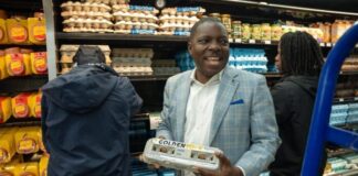 Jomo Campbell Minister of Agriculture and Marine Resources delivers Golden Yolk Project to Supervalue stores.