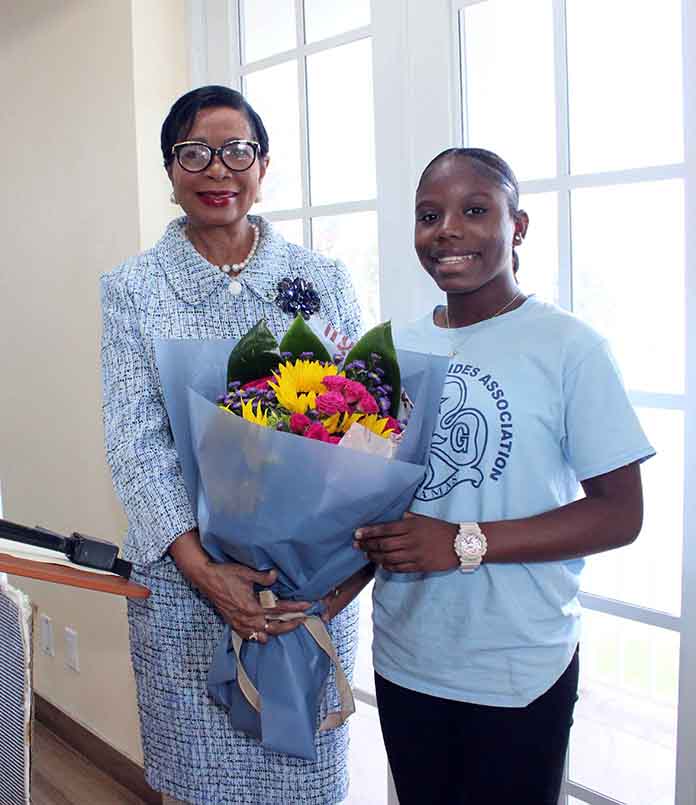 Girl Guide De’Ann Bostwick presents a bouquet of flowers to Mrs. Ann Marie Davis, of the Office of the Spouse of the Prime Minister, on behalf of the Bahamas Girl Guides Association (BGGA)