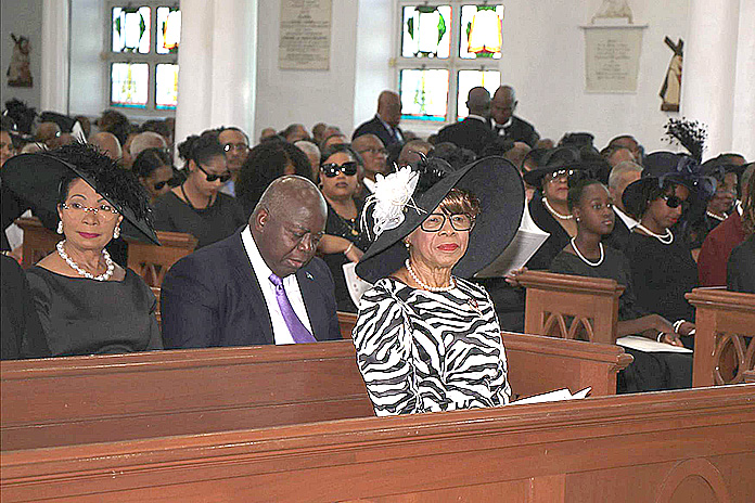 Governor- General Dame Cynthia Pratt, Prime Minister Philip Davis KC and Mrs Ann Marie Davis at the State Recognized funeral for the late Archbishop Drexel Wellington Gomez at Christ Church Cathedral.