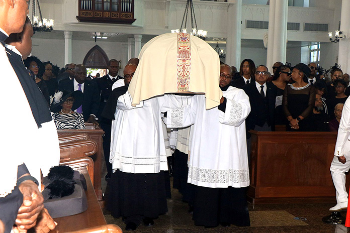 Priest carry the coffin of Archbishop Drexel Wellington Gomez into Christ Church Cathedral.